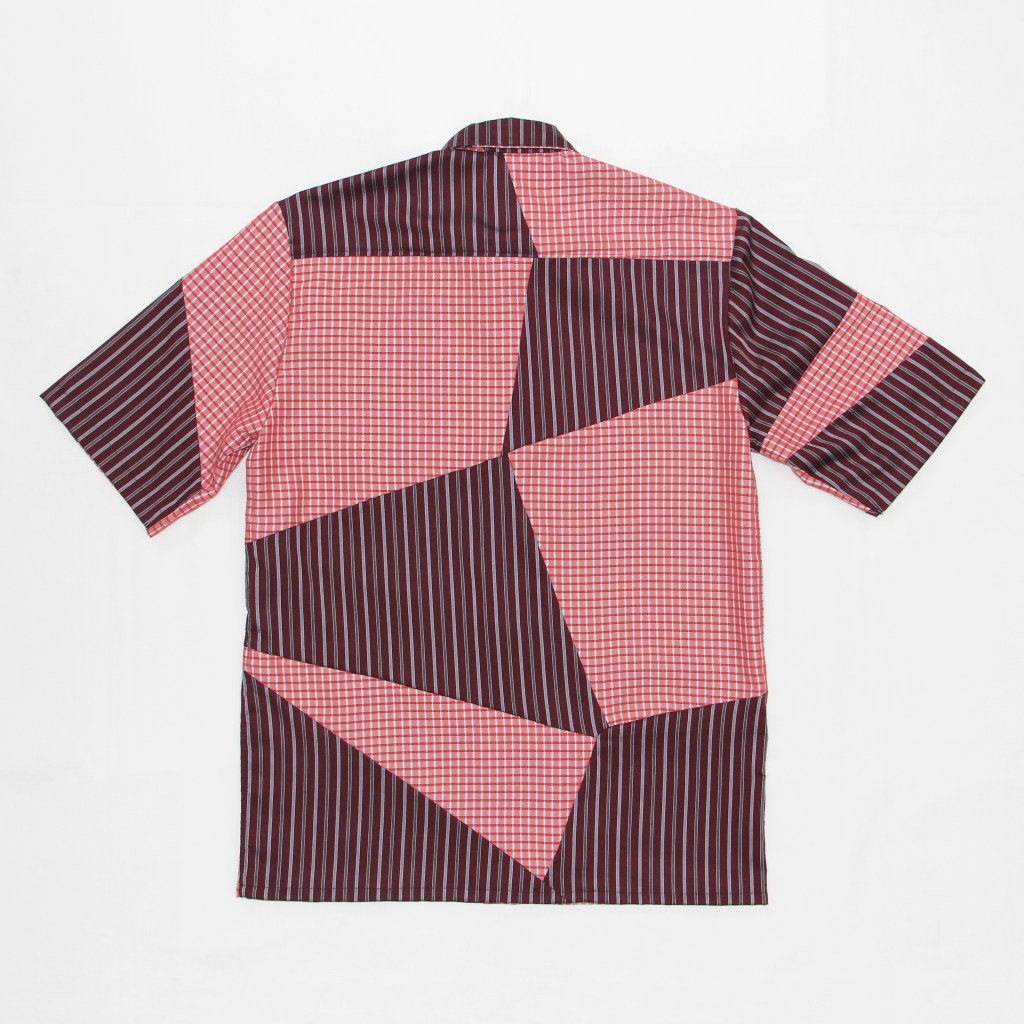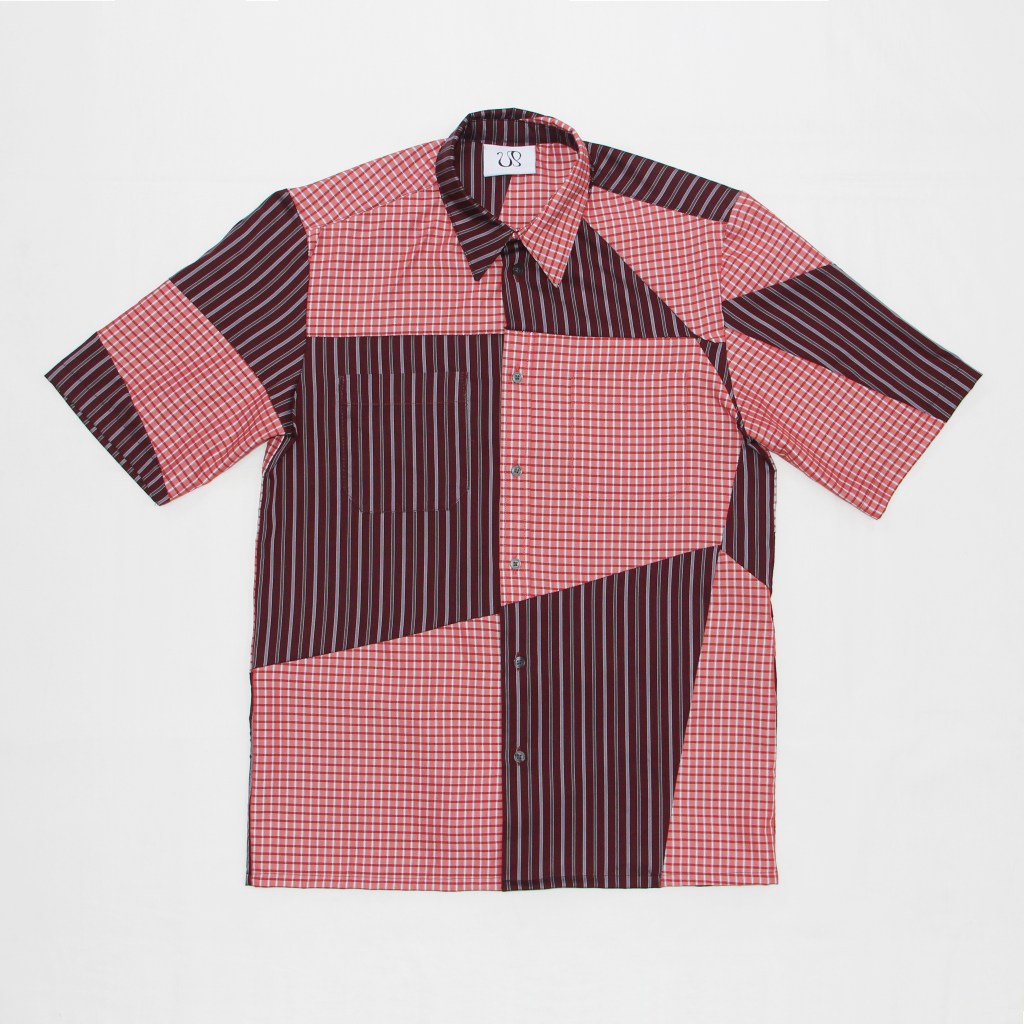 Two ethically sourced red check and striped shirting fabrics sustainably upcycled together using modern repurposing techniques into a contrasting block patchwork effect.