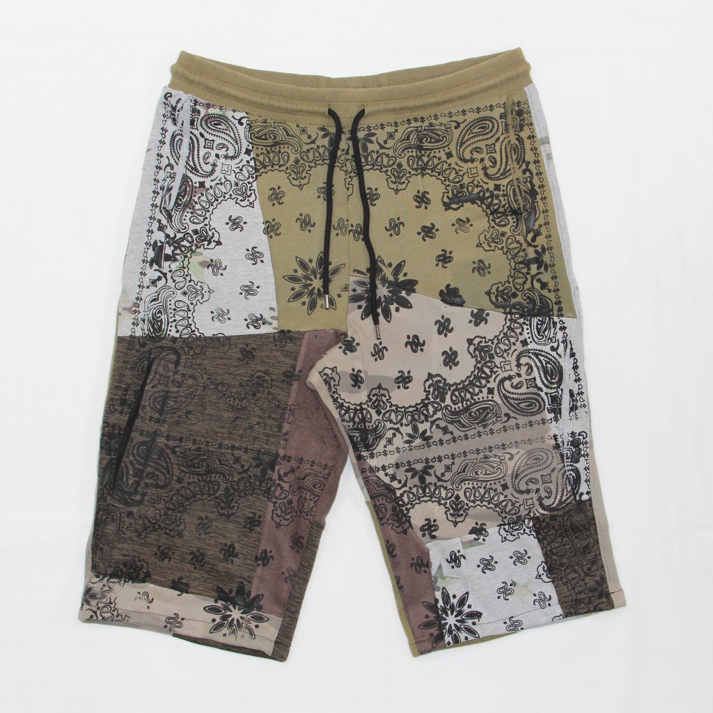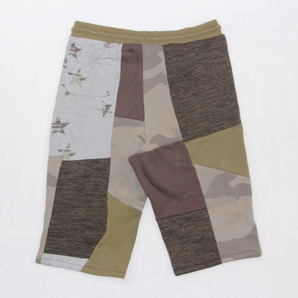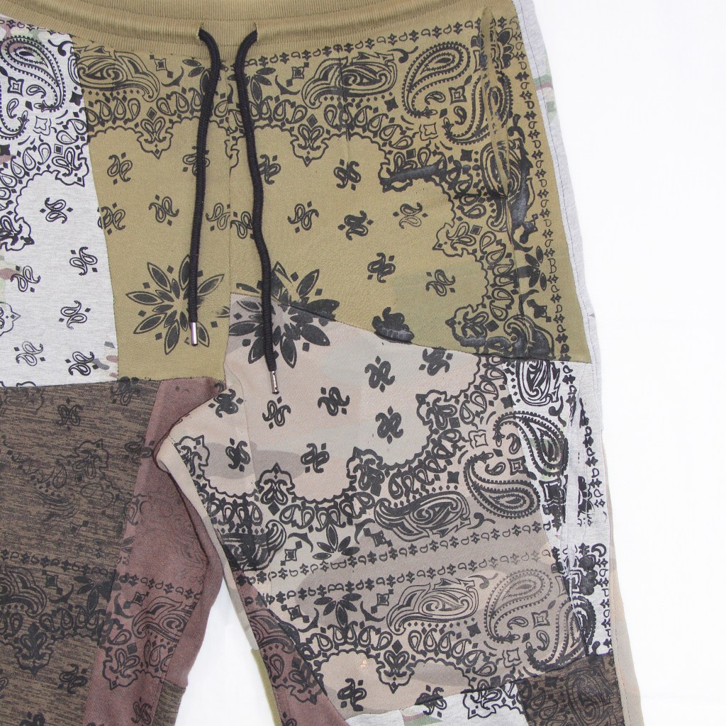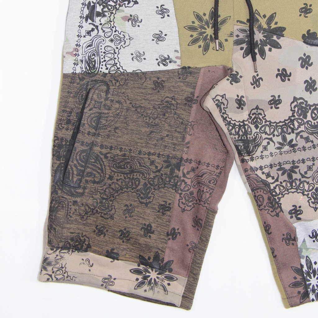 Multiple tones of ethically sourced heavyweight camouflage, brown and green sweatshirting fabrics sewn together as the base. Black bandana graphic screen printed on top of front panels using traditional desginer zero-waste techniques.