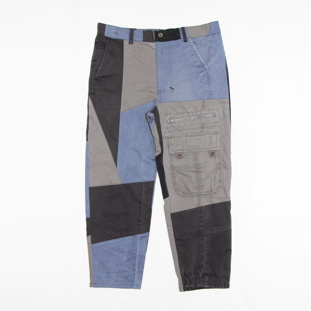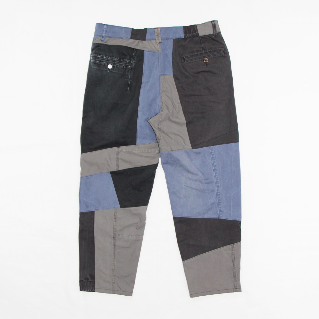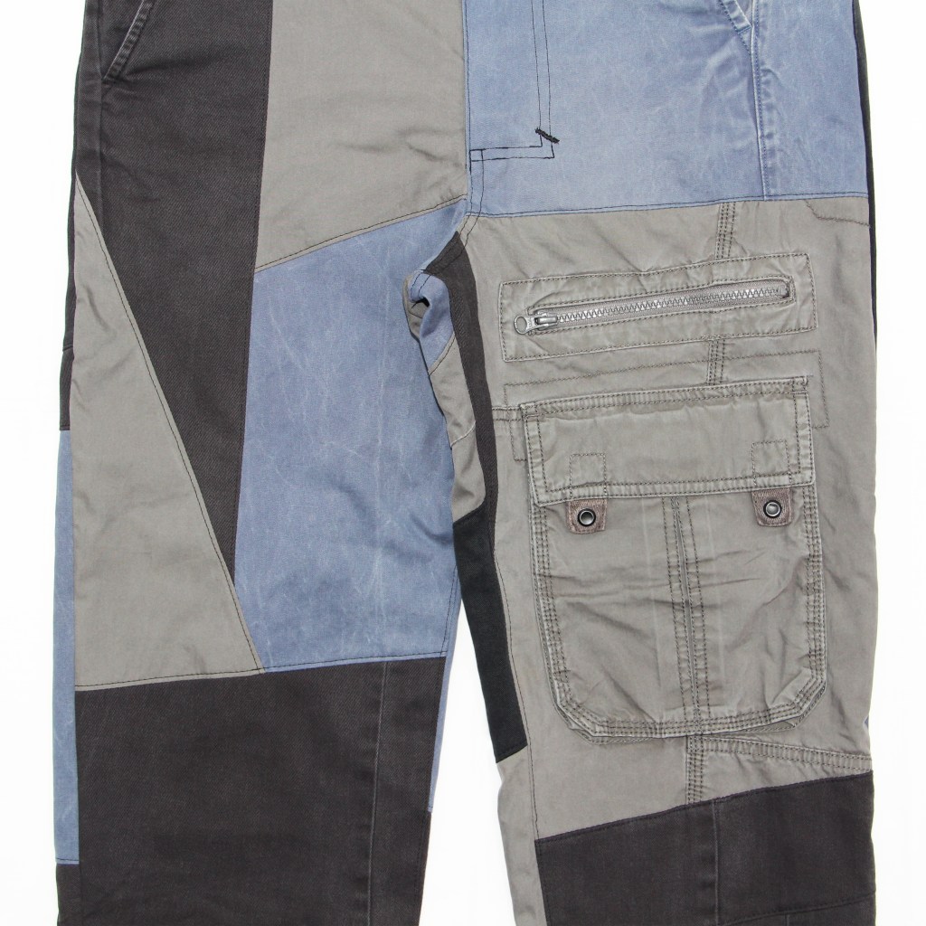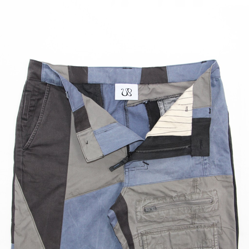 Three different ethically sourced chino and cargo fabrics sewn abstractly over the OD trouser block.