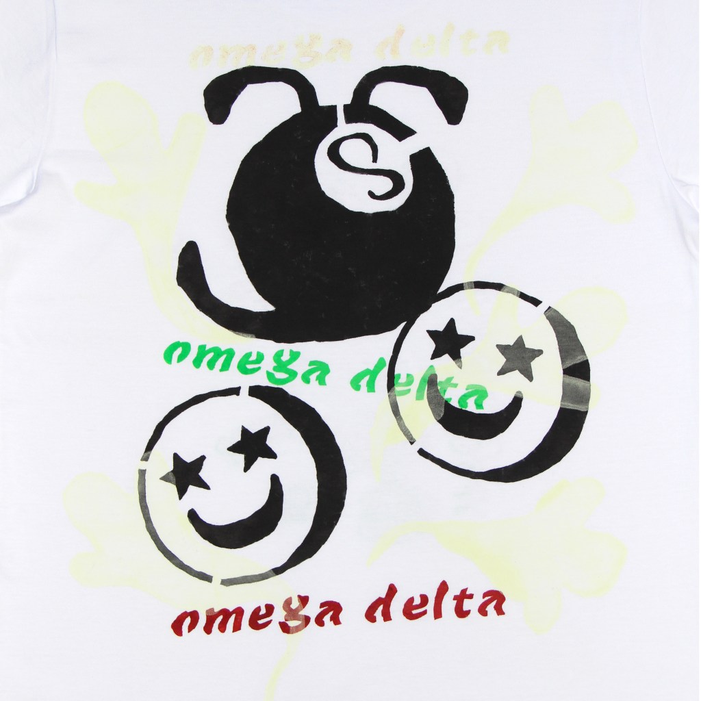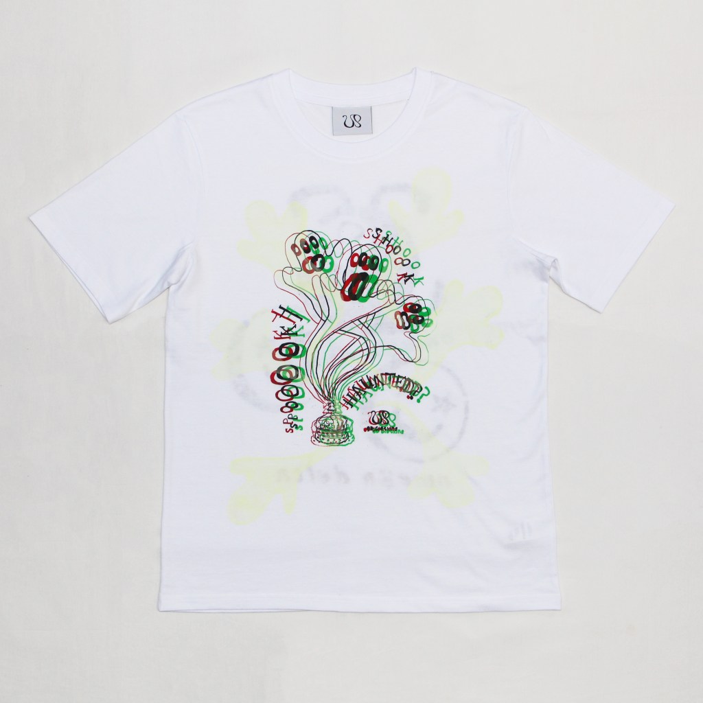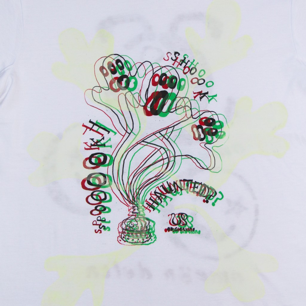 Made of 3 coloured screen prints, hand-sponged stencils and wayyy too many glow-in-the-dark ghosts screen printed all over the piece.
