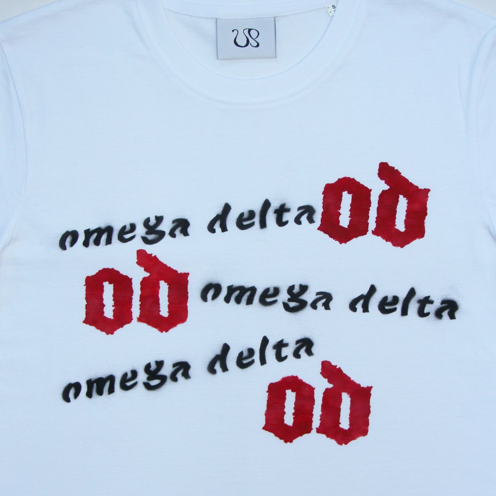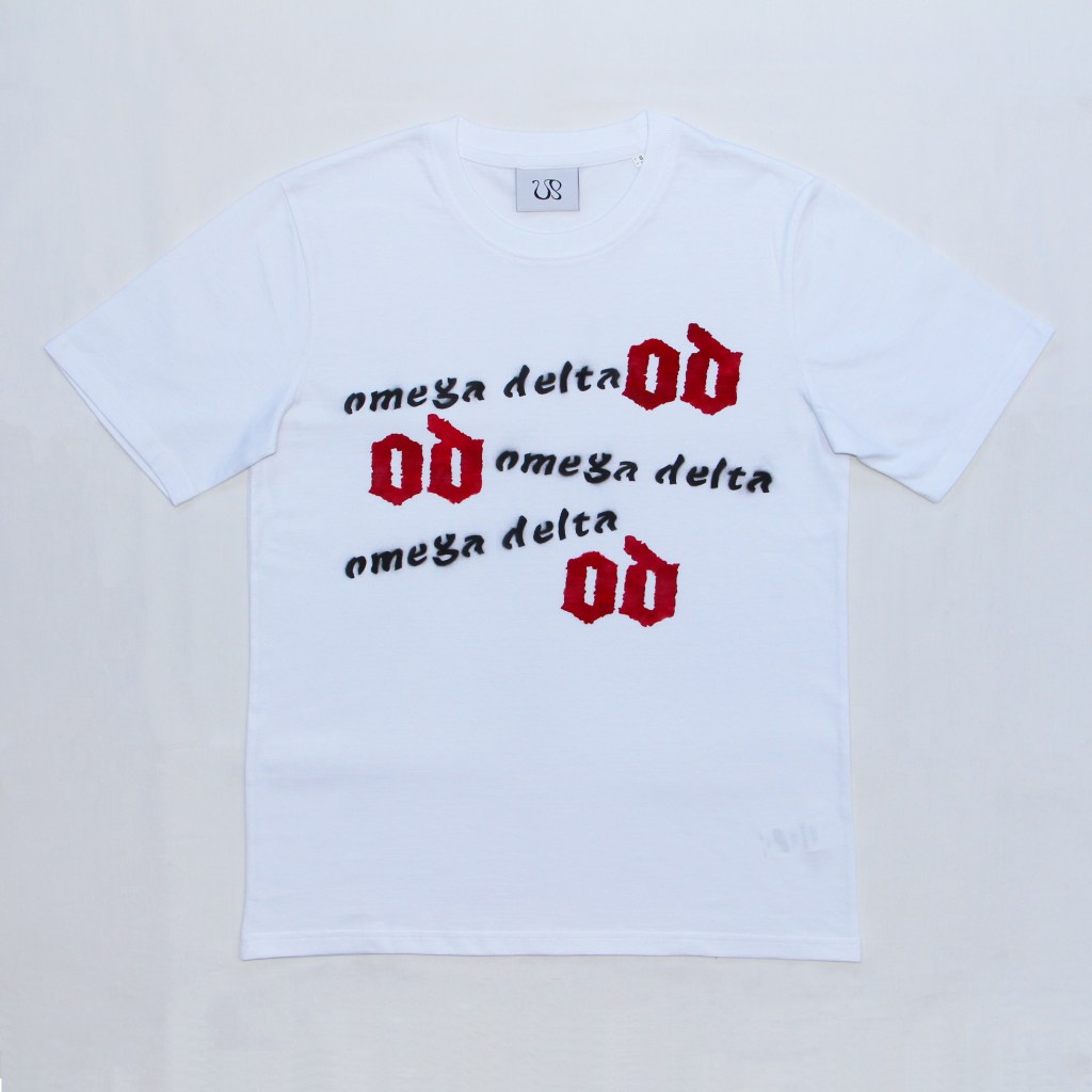 Baroque OD logo sponge stencilled by hand over the front in a bold blood red and omega delta name brand logo airbrushed around interlinking with baroque OD logo. Statement piece to scream out OD to the heavens.