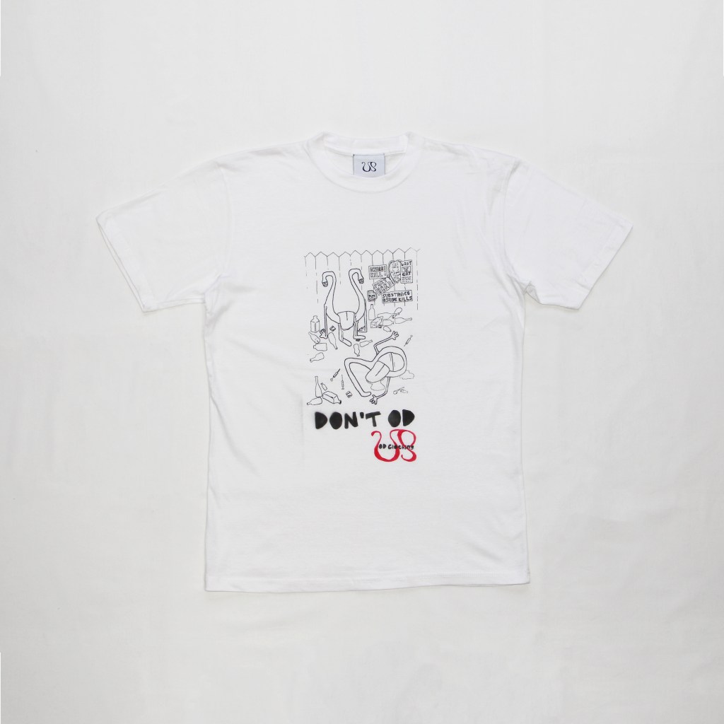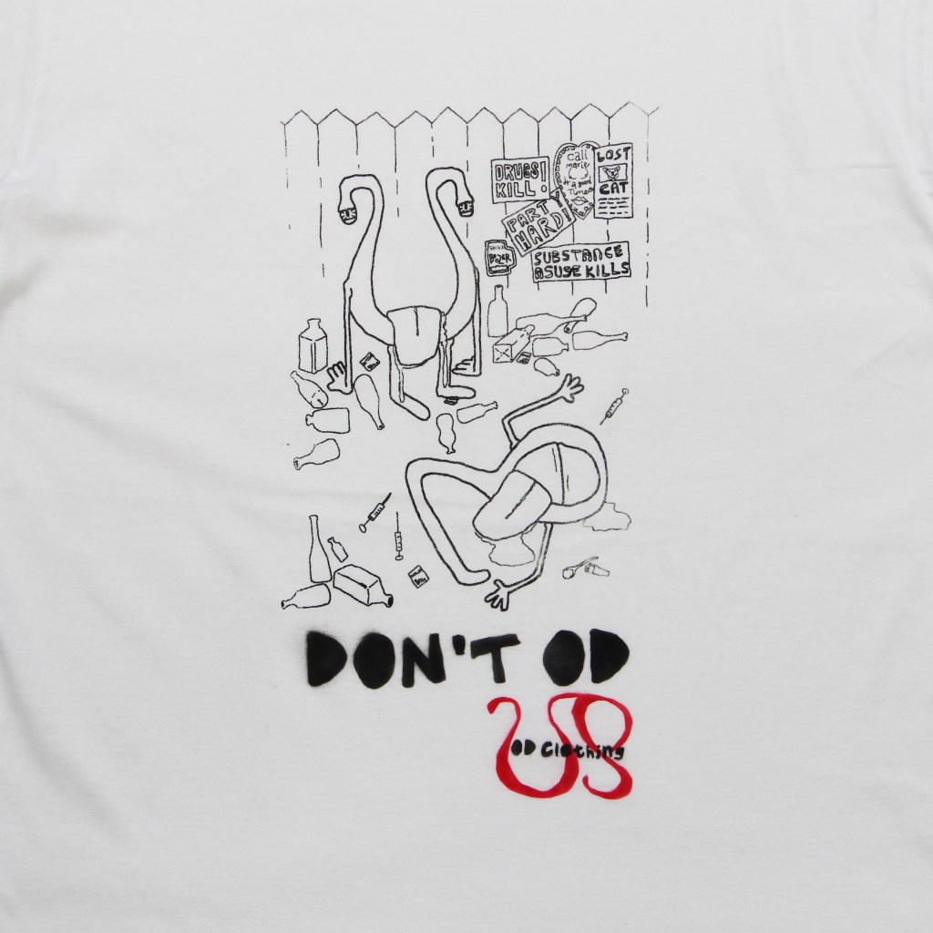 An OD original drawn graphic has been digitalised and screen printed on top of the tee – with the text and logo being airbrushed on top.
