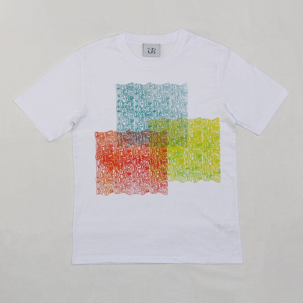 An OD original drawn graphic has been digitalised and screen printed on top of the front of the tee in blue, lime and red colours. Any colours can be matched for a custom order.
