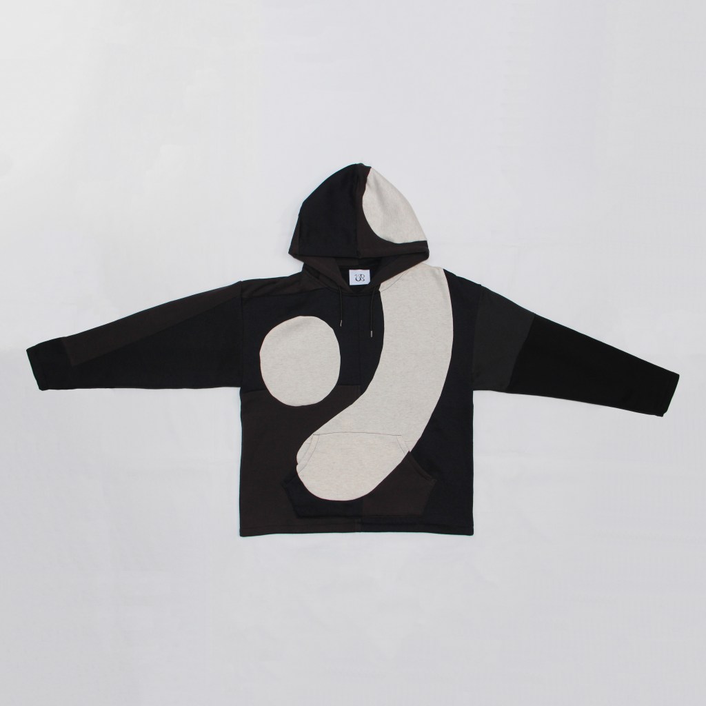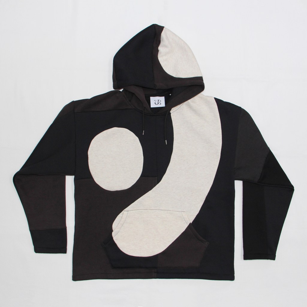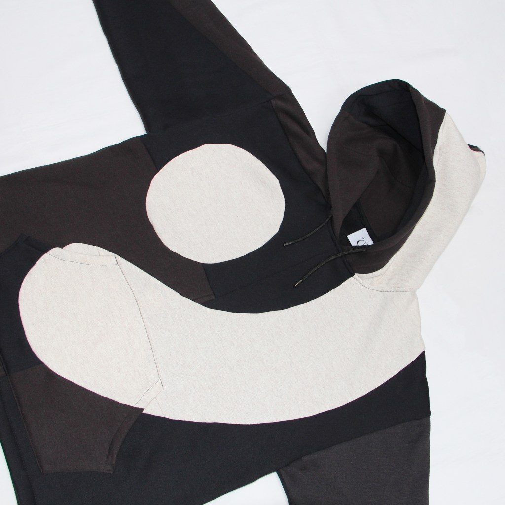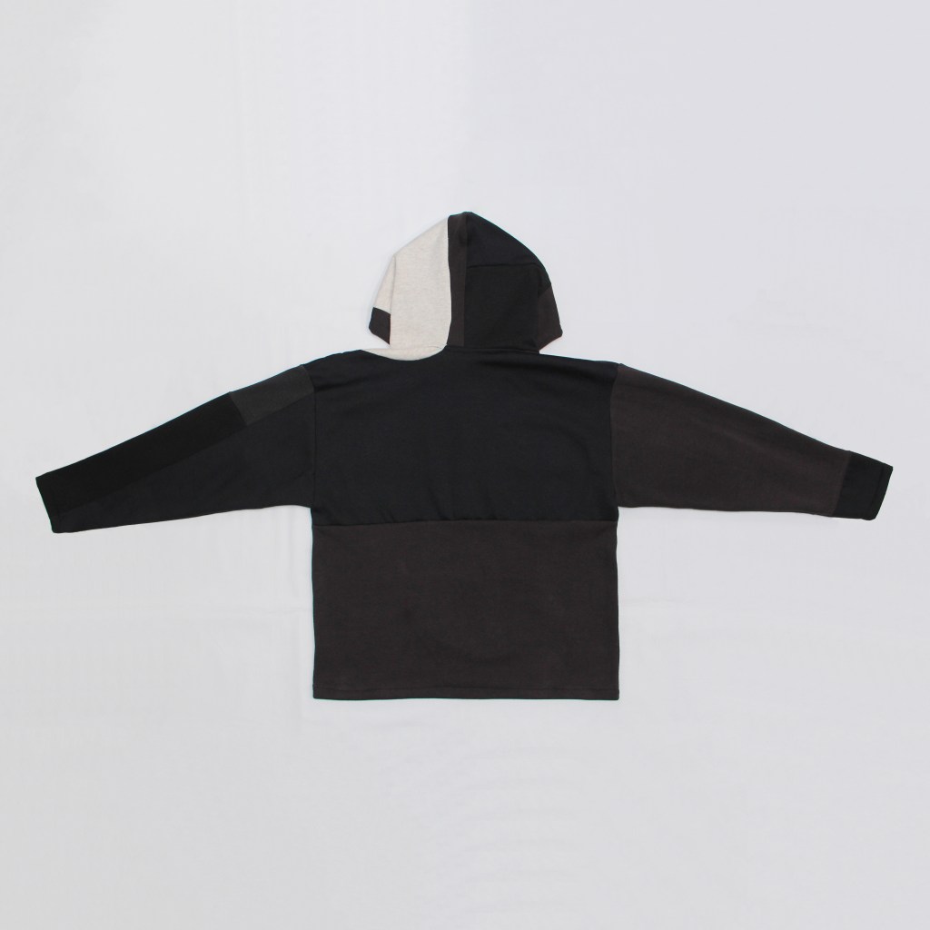Vintage heavyweight sweatshirting patchworked to form a repurposed reworked base hoodie with a stone sweatshirting detail pattern cut into the front and hood of the piece.