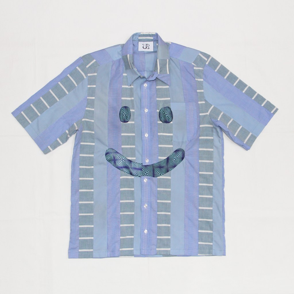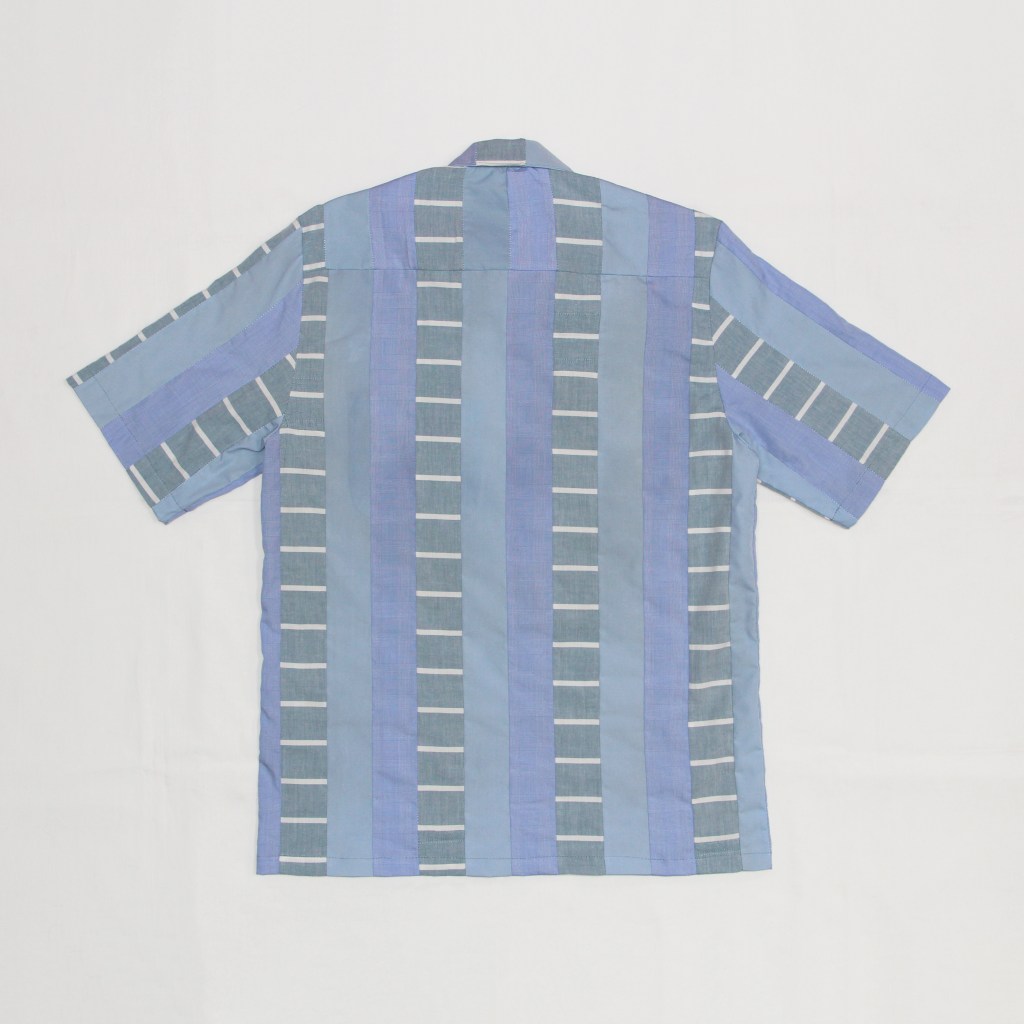 Three cotton sustainably sourced cotton blend woven shirting fabrics all cut into repurposed and upcycled strips repeating over the shirt surface.
