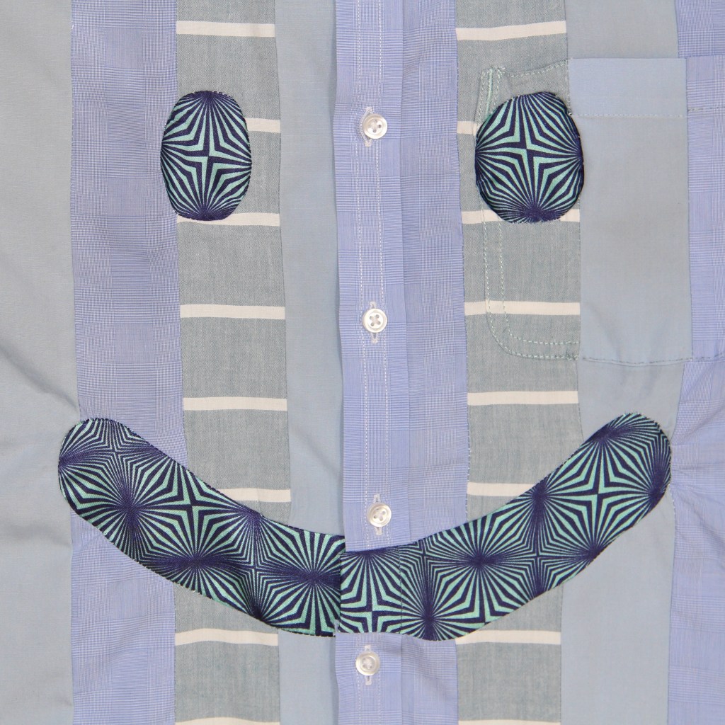 Contrast designer smiley face detail technically stitch-inserted into the surface of the shirt in a 60s vibe poly-cotton fabric.