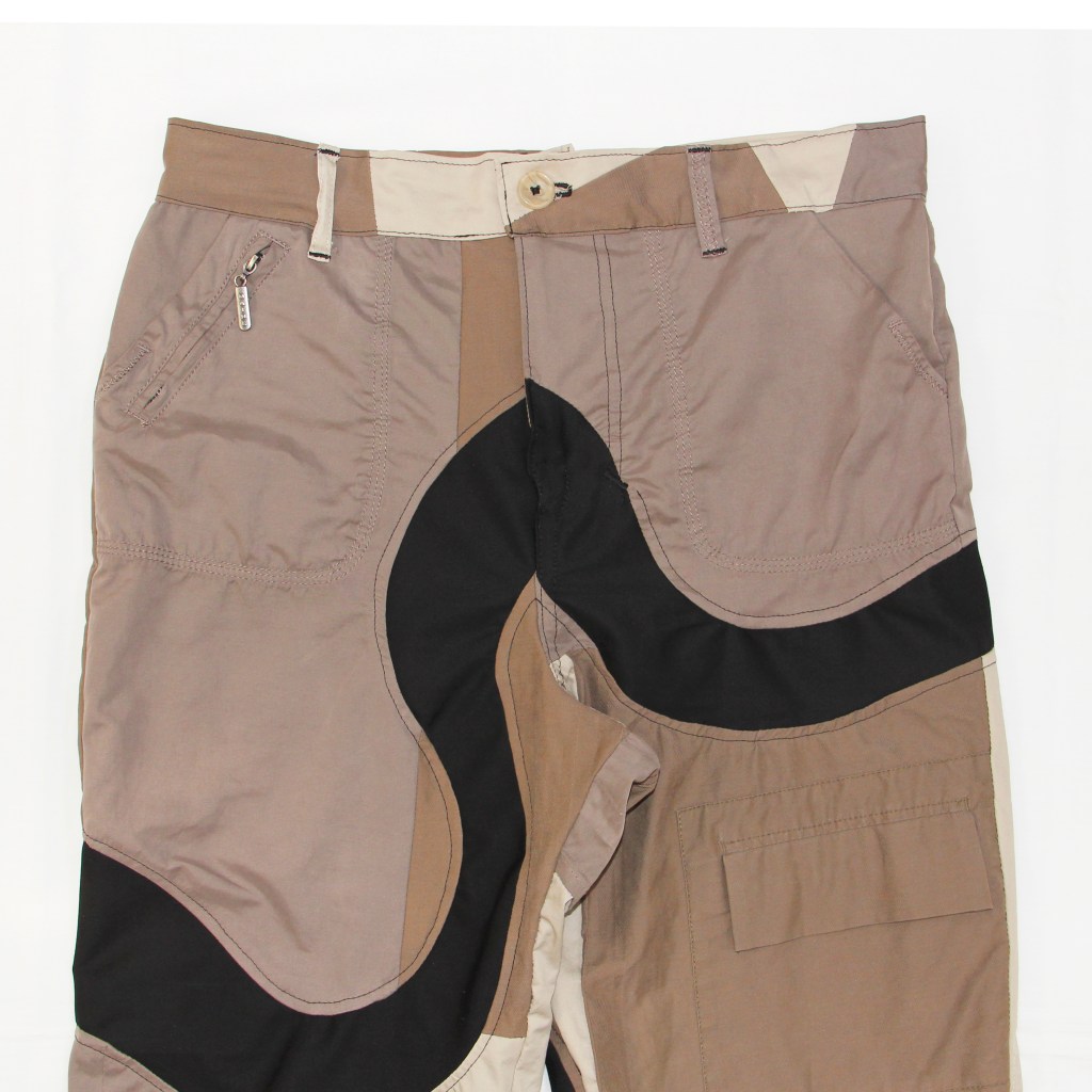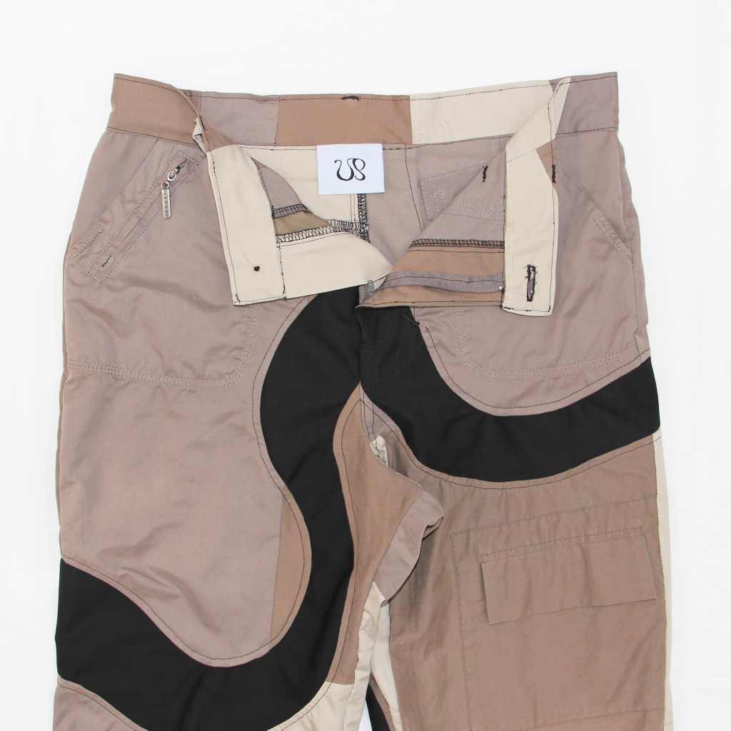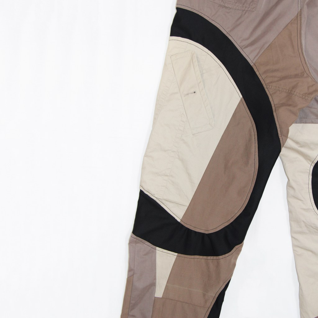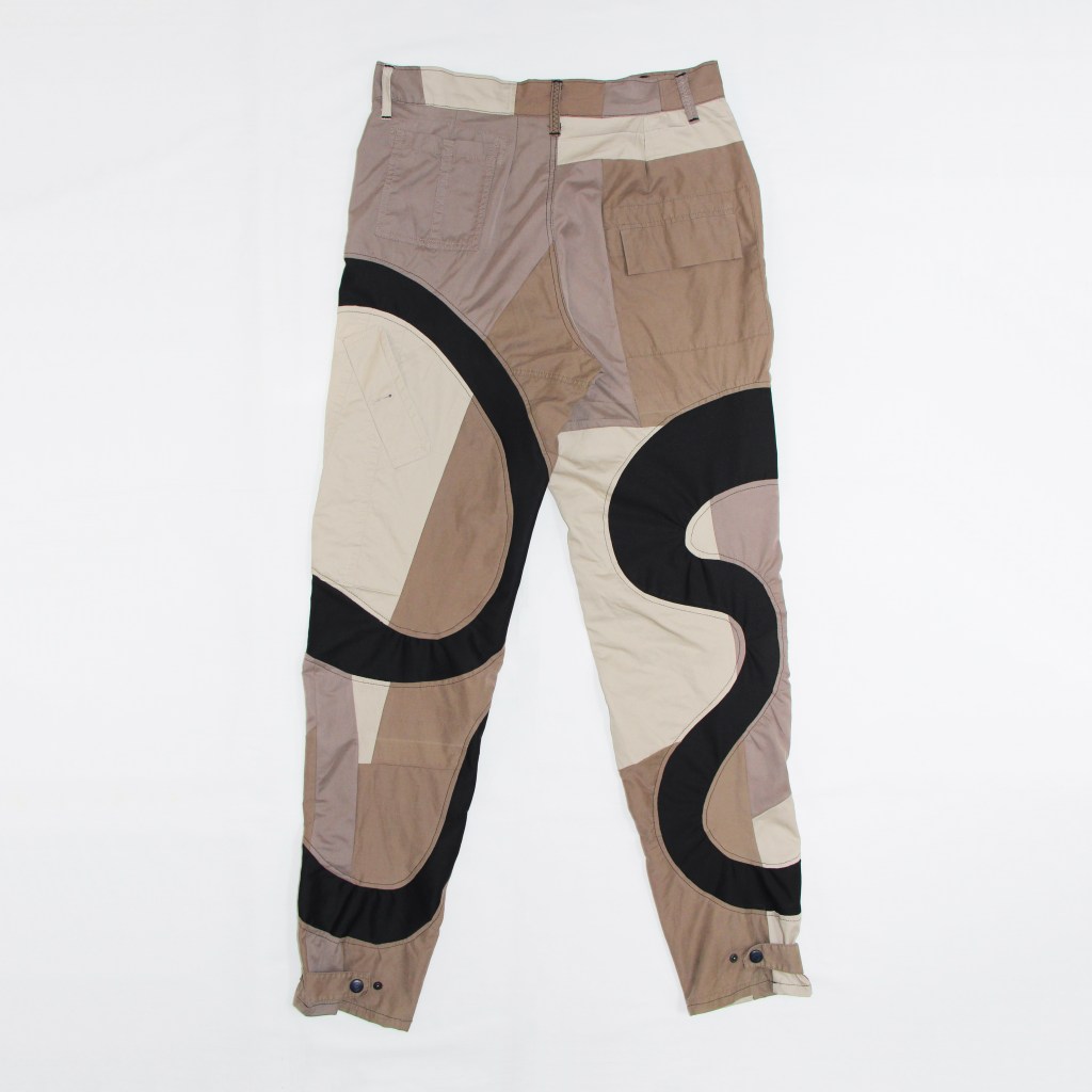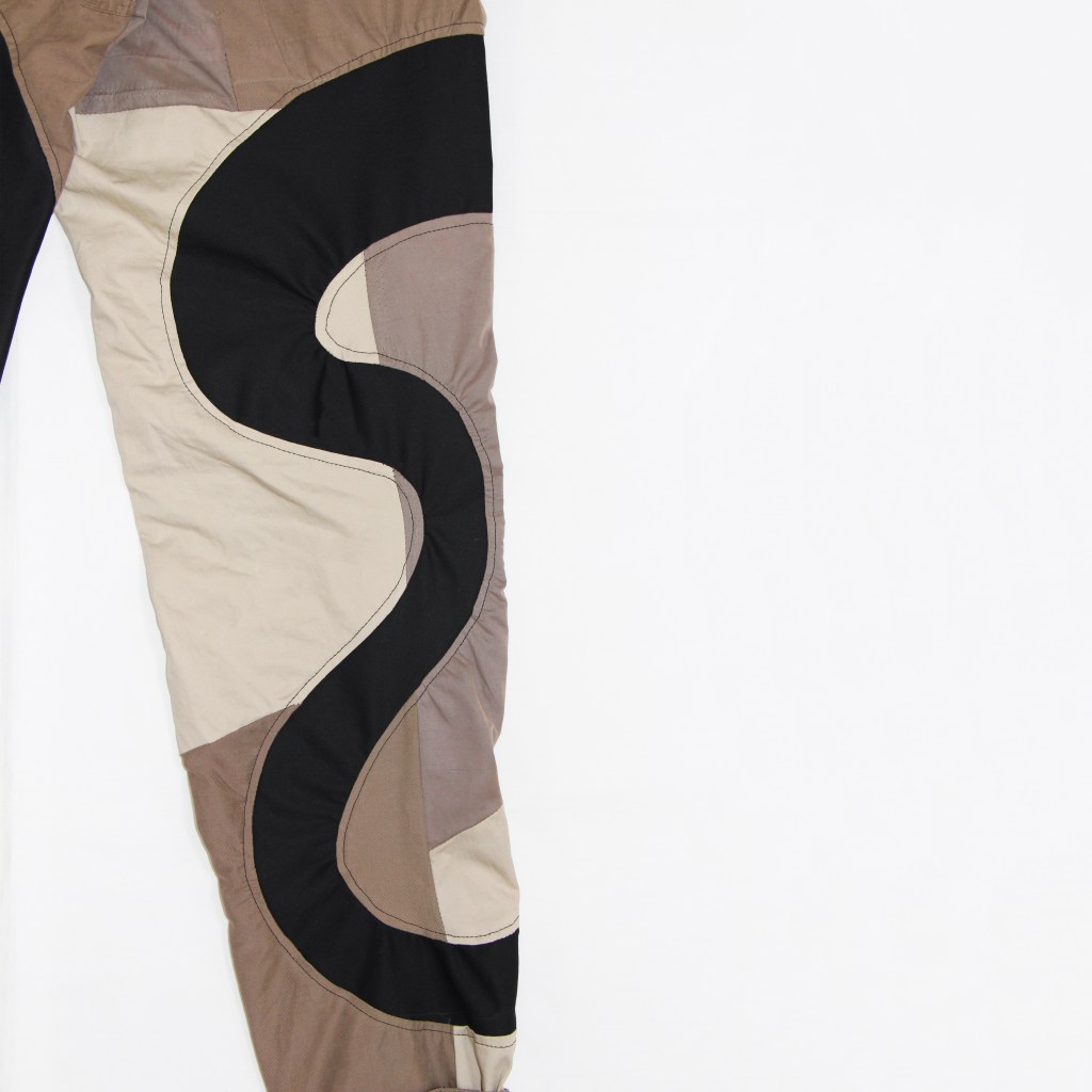 Upcycled donated mac coats and cargo pants base layer with deadstock black canvas twill intricately pattern cut as a wavy smile pattern all over legs of trousers.