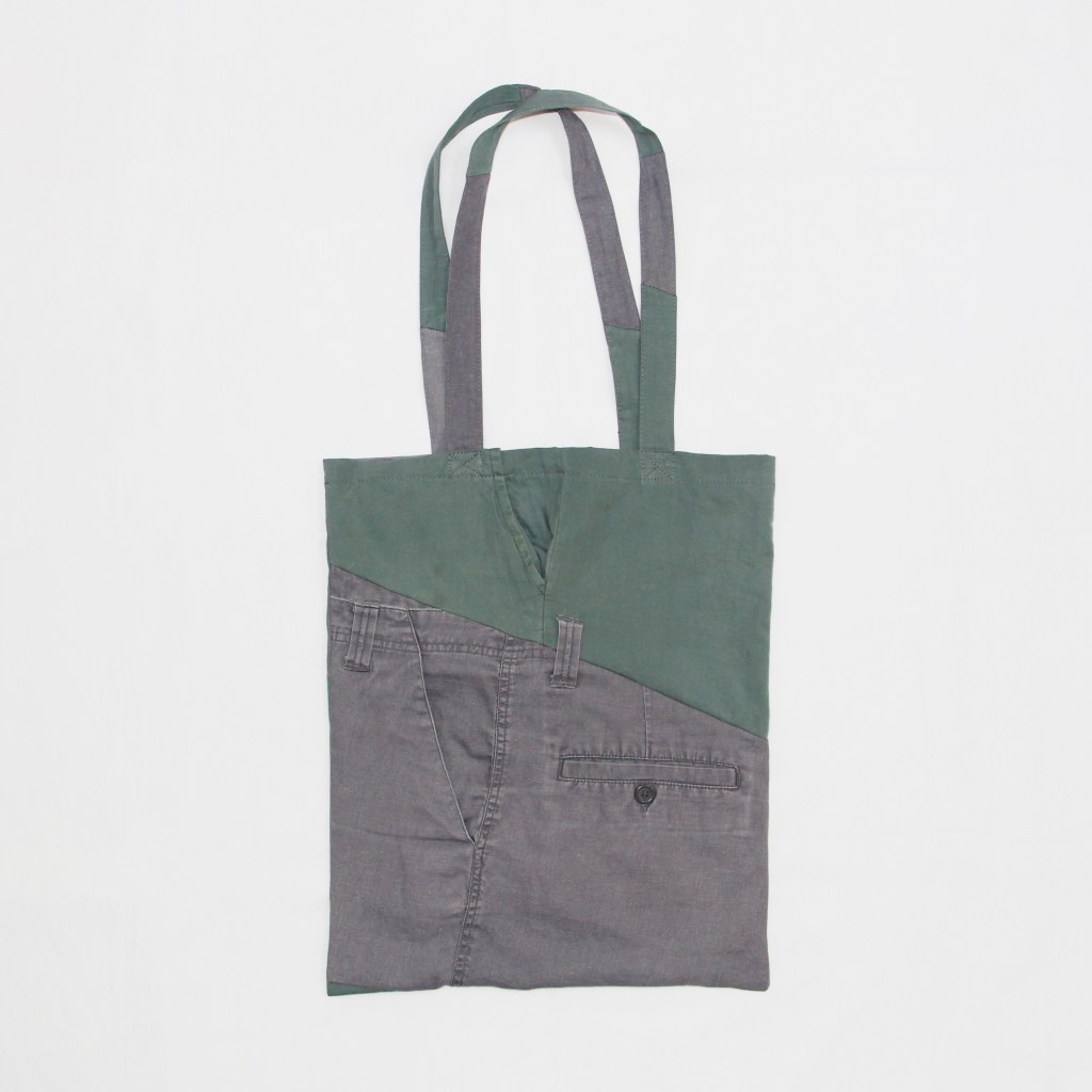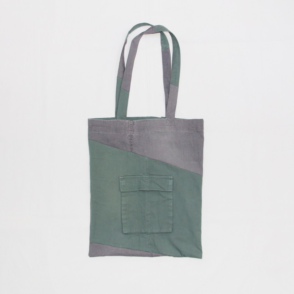 Two lightweight canvas-chino fabrics in army green and machine-gun grey colours repurposed into an on-the-go functional tote, with pockets from original garments integrated onto outside.