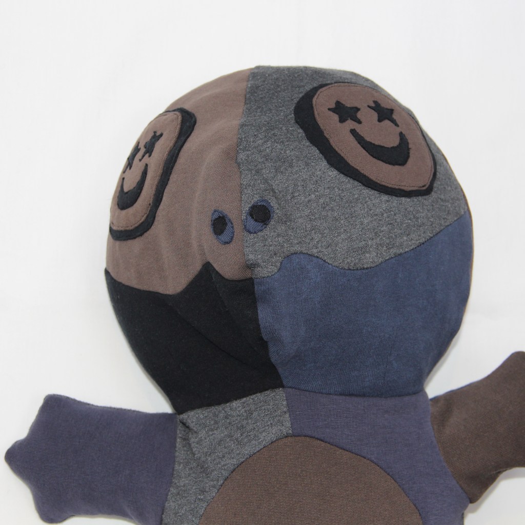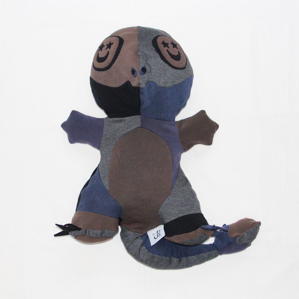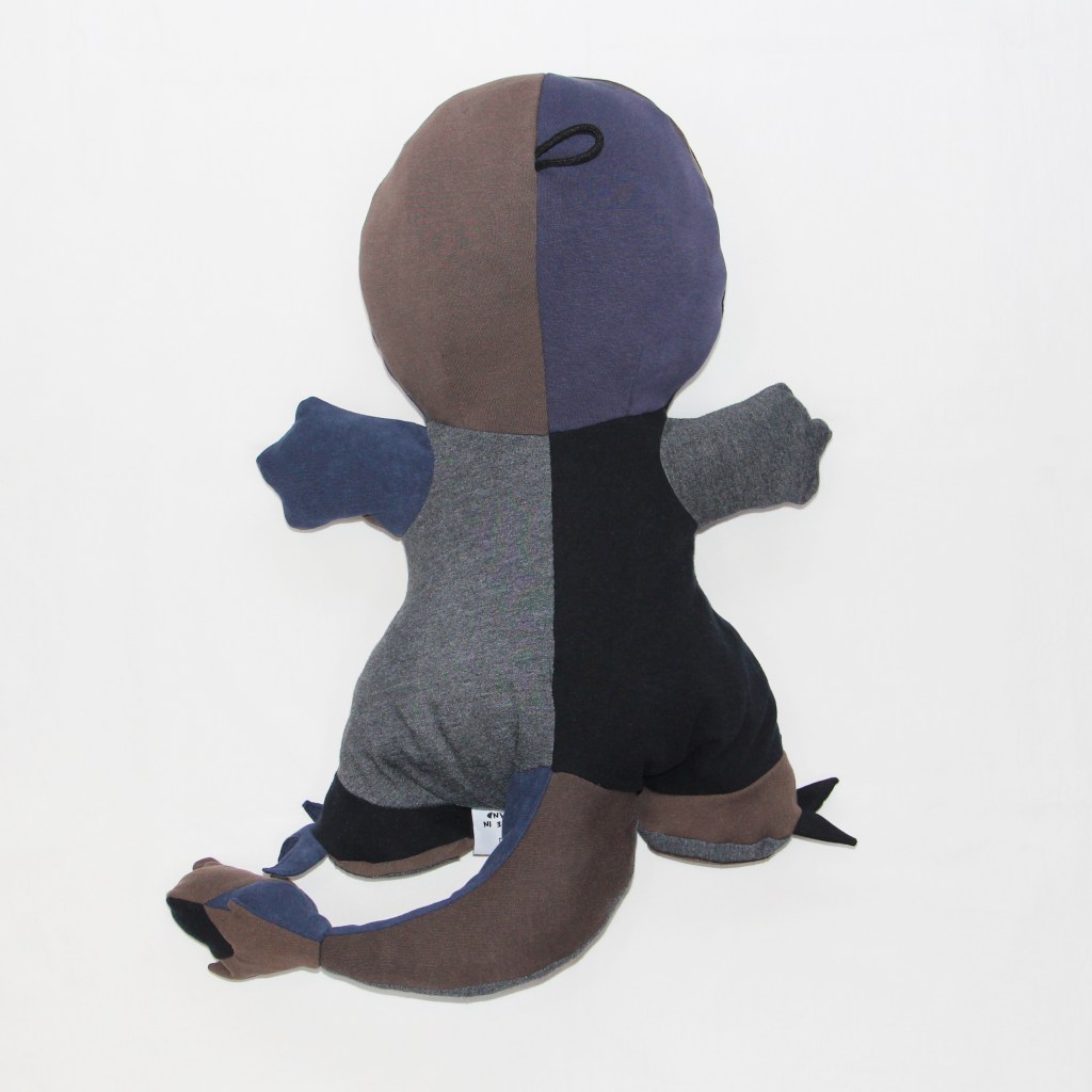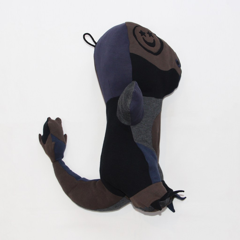 The stuffing used has all been collected from offcuts from previous projects that have been too small to use – making this piece a zero waste plushie! As this piece has a knitted jersey weave outer I have used only knitted-jersey fabric offcuts, so the piece has a very soft and in keeping hand-feel and squeeze.