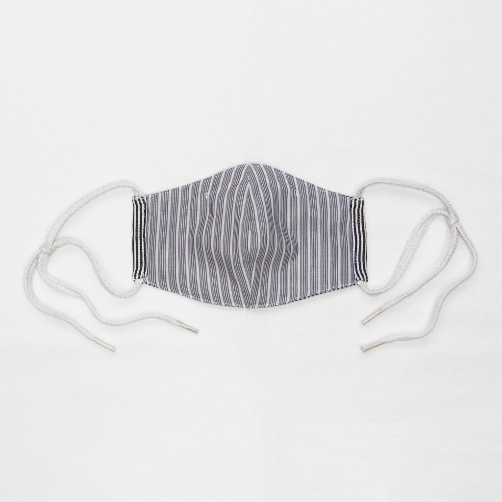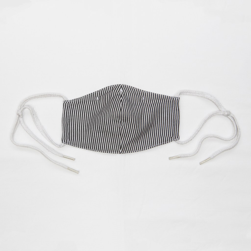 Fully reversible cotton pinstripe mask with easy to use adjustable drawcords to fit behind ear.